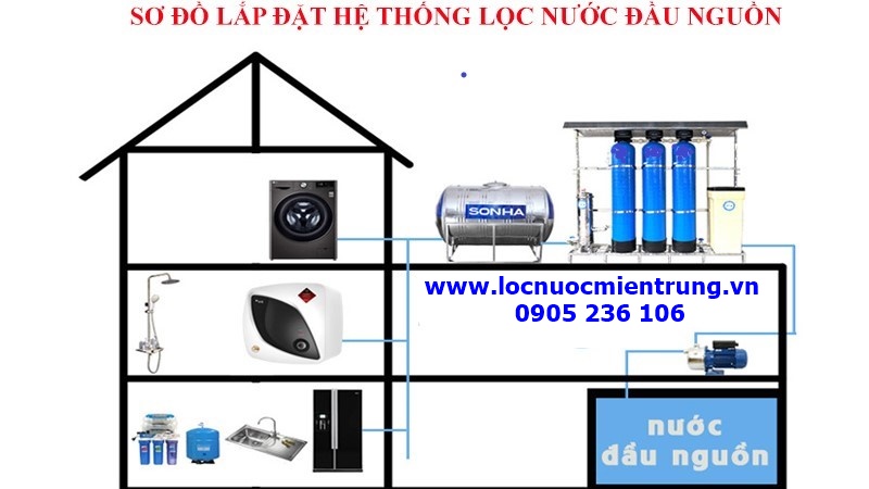 Thiết bị lọc nước đầu nguồn là được lắp đặt ở vị trí trung gian giữa nguồn nước đầu vào và bồn, bể chứa nước sinh hoạt của gia đình, cơ quan, xí nghiệp. Cụ thể nước từ nhà máy được dẫn về rồi qua hệ thống lọc tổng . Tại đây nước được làm sạch bởi các lõi lọc và cơ chế hấp phụ tạp chất của vật liệu lọc. Sau đó nước sạch được dẫn vào bồn, bể chứa nước thành phẩm trươc khi dẫn tới các vòi, máy giặt, bồn cầu và các thiết bị sử dụng nước khác.